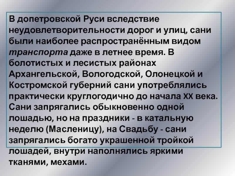Слайд 22В допетровской Руси вследствие неудовлетворительности дорог и улиц, сани были