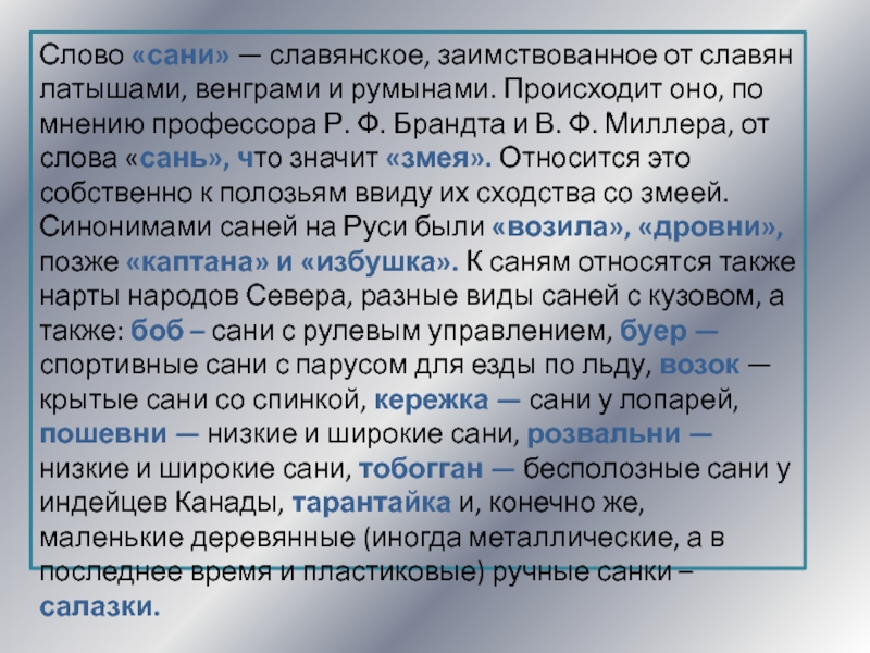 Слайд 11Слово «сани» — славянское, заимствованное от славян латышами, венграми и