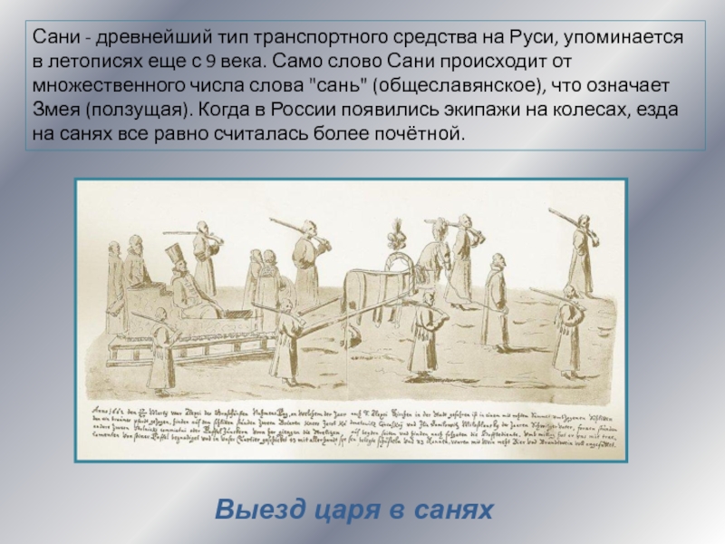 Слайд 7Сани - древнейший тип транспортного средства на Руси, упоминается в
