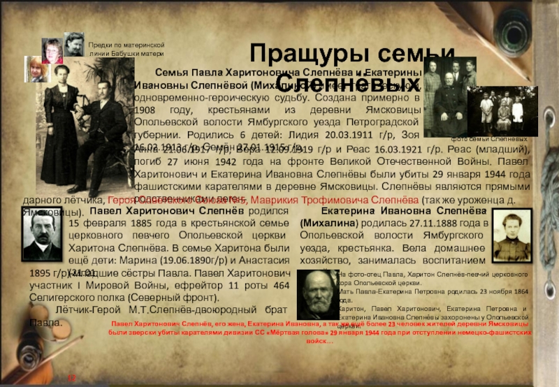 Анна 21.06.1917 г/р, Вера 12.09.1919 г/р и Реас 16.03.1921 г/р. Реас (младший), погиб 27 июня 1942 года на фронте Великой Отечественной Войны. Павел Харитонович и Екатерина Ивановна Слепнёвы были убиты 29 января 1944 года фашистскими карателями в деревне Ямсковицы. Слепнёвы являются прямыми родственниками леген-