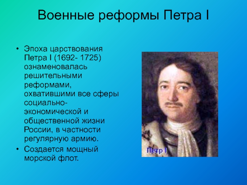 Слайд 12Основное содержание военных реформ Петра I сводилось к следующему