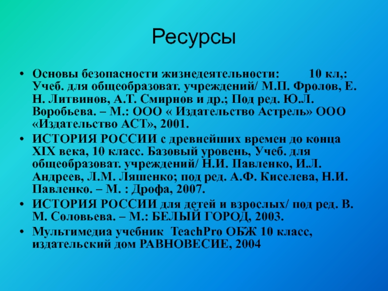 ИСТОРИЯ РОССИИ с древнейших времен до конца XIX века, 10 класс. Базовый уровень, Учеб. для общеобразоват. учреждений/ Н.И. Павленко, И.Л. Андреев, Л.М. Ляшенко; под ред. А.Ф. Киселева, Н.И. Павленко. – М. : Дрофа, 2007.