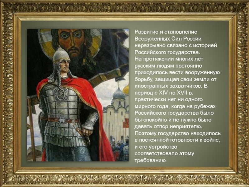 Слайд 7Развитие и становление Вооруженных Сил России неразрывно связано с историей