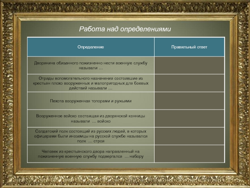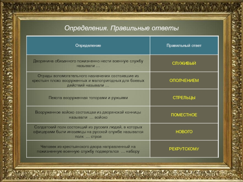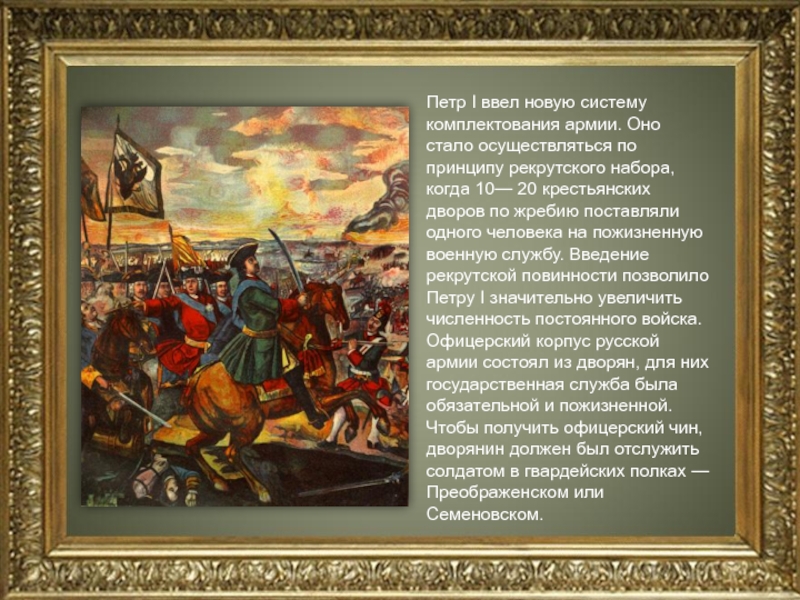 жребию поставляли одного человека на пожизненную военную службу. Введение рекрутской повинности позволило Петру I значительно увеличить численность постоянного войска. Офицерский корпус русской армии состоял из дворян, для них государственная служба была обязательной и пожизненной. Чтобы получить офицерский чин, дворянин должен был отслужить солдатом в гвардейских полках — Преображенском или Семеновском.
