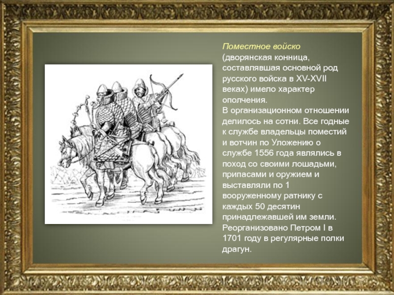 Слайд 12Поместное войско (дворянская конница, составлявшая основной род русского войска в