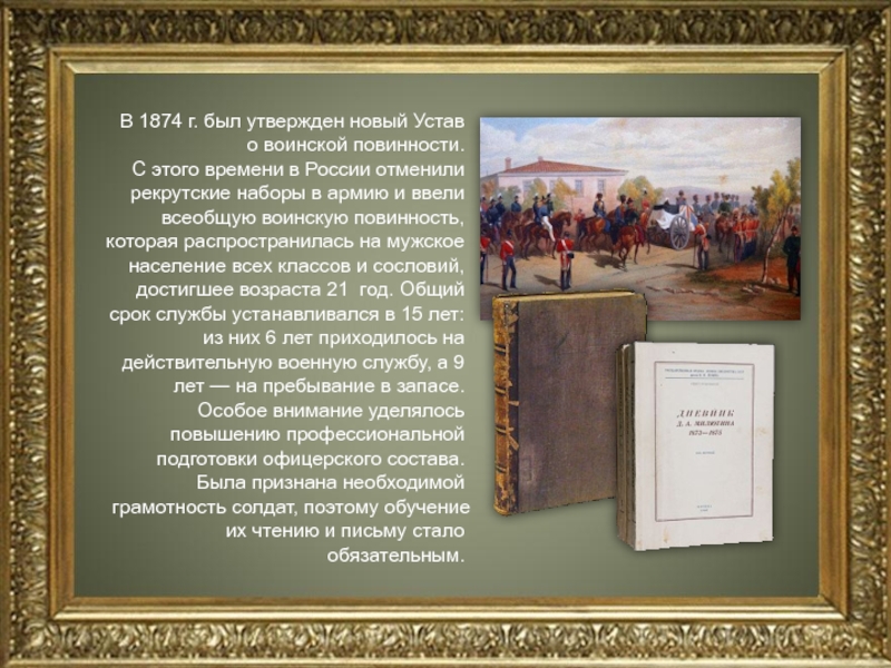 Слайд 21В 1874 г. был утвержден новый Устав о воинской повинности.