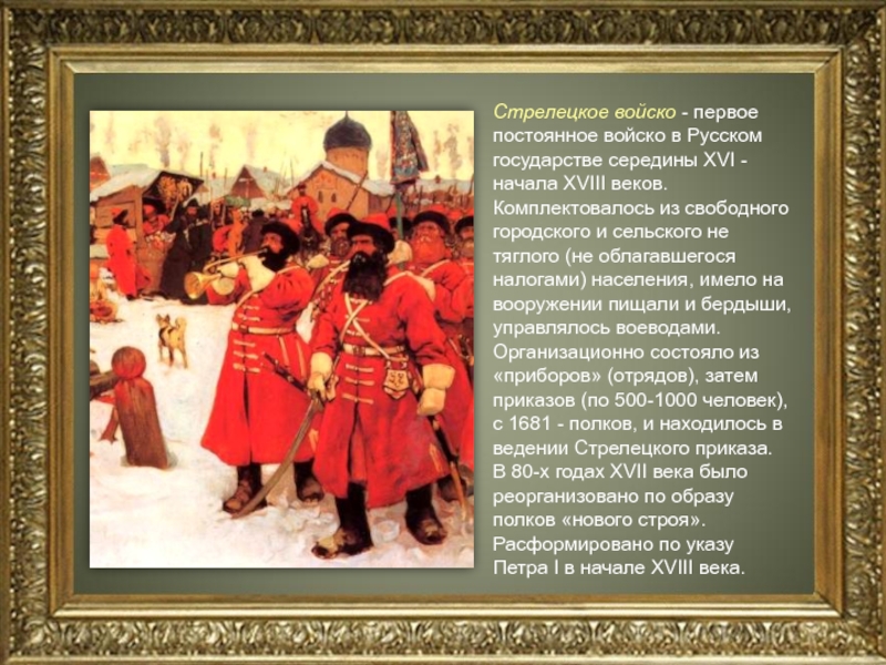 Слайд 13Стрелецкое войско - первое постоянное войско в Русском государстве середины
