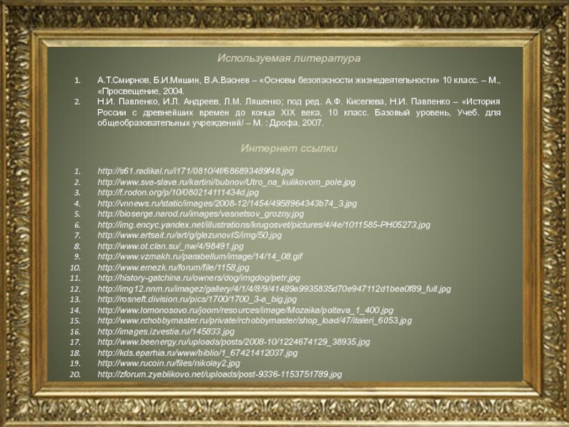 ред. А.Ф. Киселева, Н.И. Павленко – «История России с древнейших времен до конца XIX века, 10 класс. Базовый уровень, Учеб. для общеобразовательных учреждений/ – М. : Дрофа, 2007.