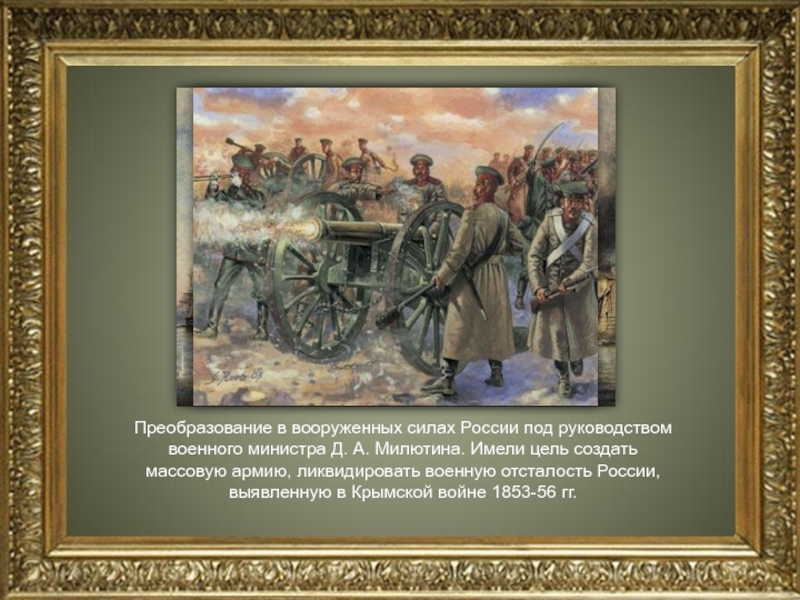А. Милютина. Имели цель создать массовую армию, ликвидировать военную отсталость