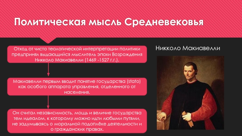 Макиавелли первым вводит понятие государства (stato) как особого аппарата управления, отделенного от населения.