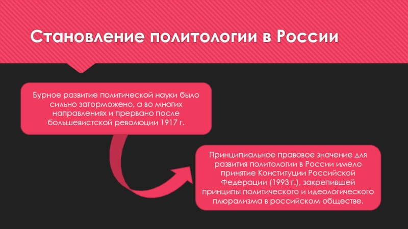 Принципиальное правовое значение для развития политологии в России имело принятие Конституции Российской Федерации (1993 г.), закрепившей принципы политического и идеологического плюрализма в российском обществе.