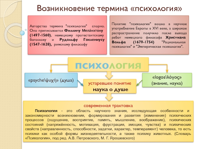 после выхода работ немецкого философа Христиана Вольфа (1679-1754) "Рациональная психология" и "Эмпирическая психология".Авторство термина "психология" спорно. Оно приписывается Филлипу Мела́нхтону (1497-1560), немецкому протестантскому богослову и Рудольфу Гоклениусу (1547-1628), римскому философу
