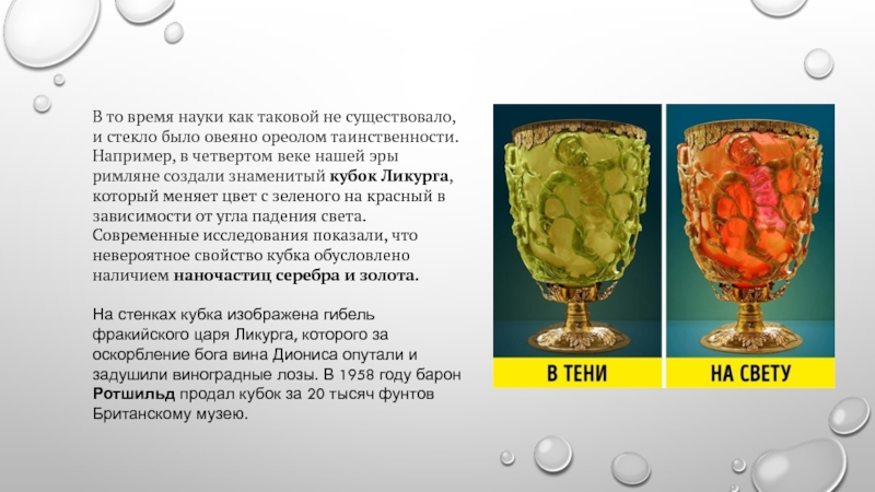 римляне создали знаменитый кубок Ликурга, который меняет цвет с зеленого на красный в зависимости от угла падения света. Современные исследования показали, что невероятное свойство кубка обусловлено наличием наночастиц серебра и золота.