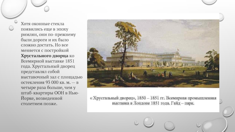 с постройкой Хрустального дворца ко Всемирной выставке 1851 года. Хрустальный дворец представлял собой выставочный зал с площадью остекления 93 000 кв. м. — в четыре раза больше, чем у штаб-квартиры ООН в Нью-Йорке, возведенной столетием позже.