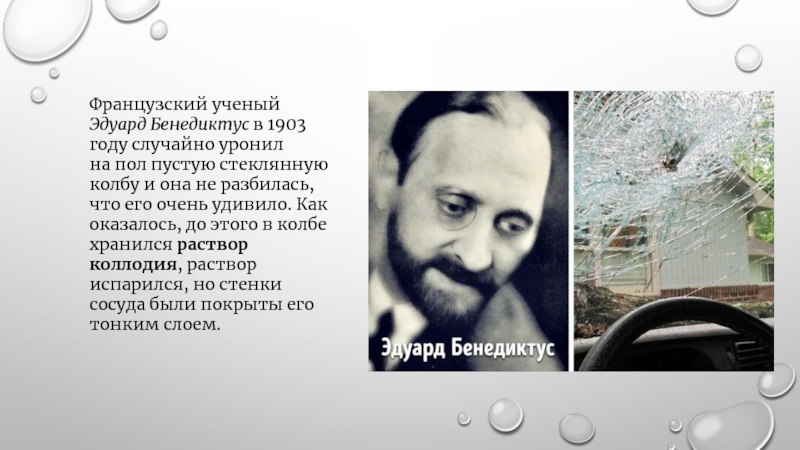 Слайд 19Французский ученый Эдуард Бенедиктус в 1903 году случайно уронил на пол пустую