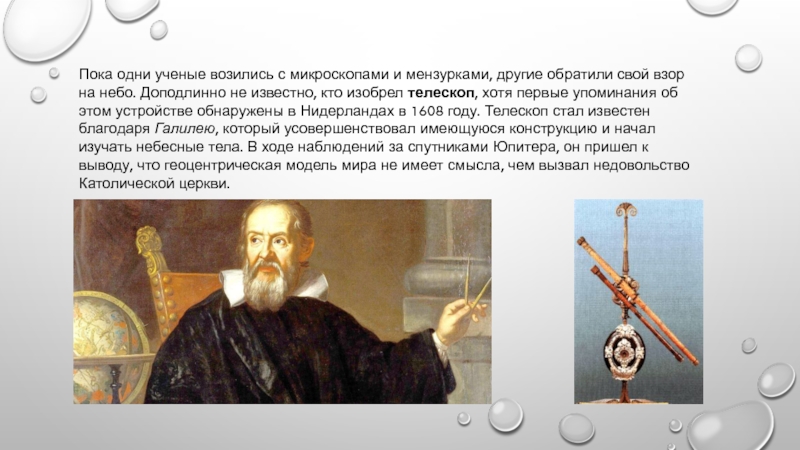 хотя первые упоминания об этом устройстве обнаружены в Нидерландах в 1608 году. Телескоп стал известен благодаря Галилею, который усовершенствовал имеющуюся конструкцию и начал изучать небесные тела. В ходе наблюдений за спутниками Юпитера, он пришел к выводу, что геоцентрическая модель мира не имеет смысла, чем вызвал недовольство Католической церкви.