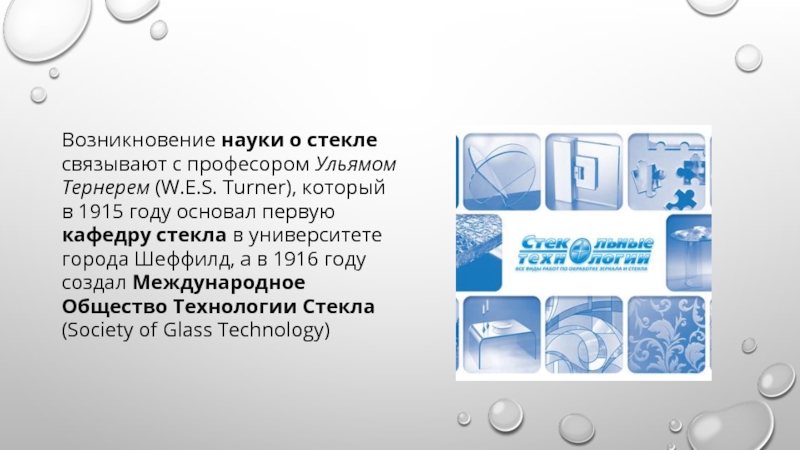 Слайд 20Возникновение науки о стекле связывают с професором Ульямом Тернерем (W.E.S.