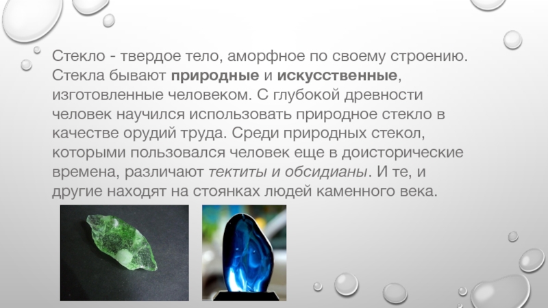 использовать природное стекло в качестве орудий труда. Среди природных стекол, которыми пользовался человек еще в доисторические времена, различают тектиты и обсидианы. И те, и другие находят на стоянках людей каменного века.