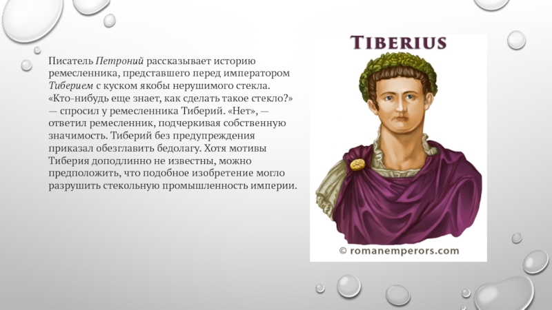 Слайд 8Писатель Петроний рассказывает историю ремесленника, представшего перед императором Тиберием с