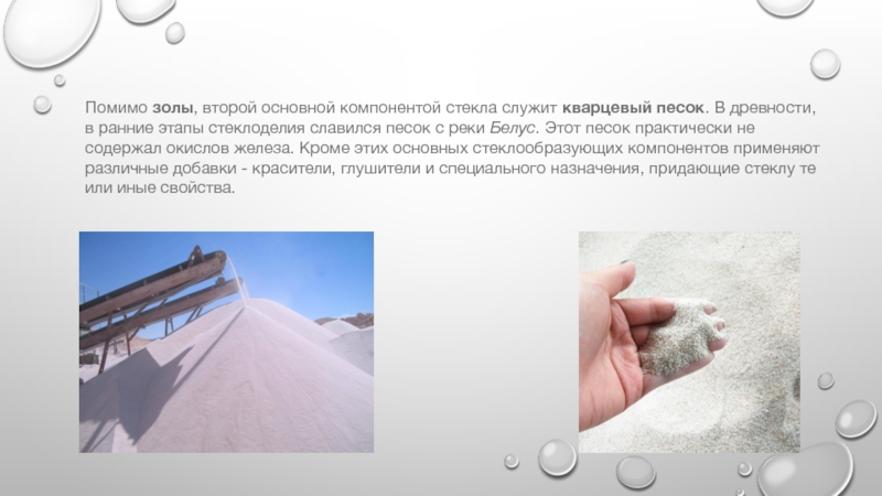 Слайд 6Помимо золы, второй основной компонентой стекла служит кварцевый песок. В