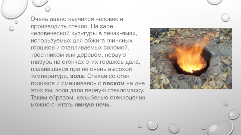 соломой, тростником или деревом, первую глазурь на стенках этих горшков дала, плавившаяся при не очень высокой температуре, зола. Стекая со стен горшков и смешиваясь с песком на дне этих ям, зола дала первую стекломассу. Таким образом, колыбелью стеклоделия можно считать ямную печь.