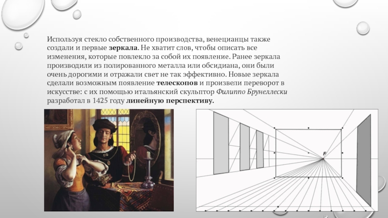Слайд 14Используя стекло собственного производства, венецианцы также создали и первые зеркала.