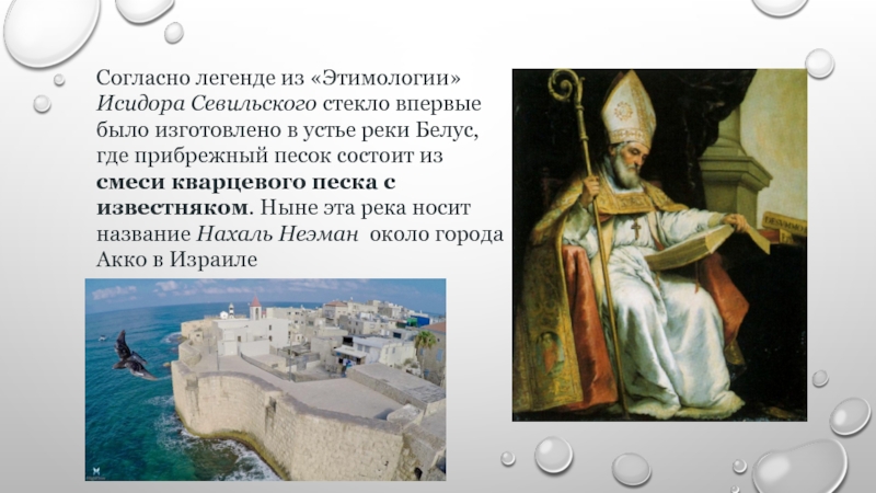 Слайд 7Согласно легенде из «Этимологии» Исидора Севильского стекло впервые было изготовлено