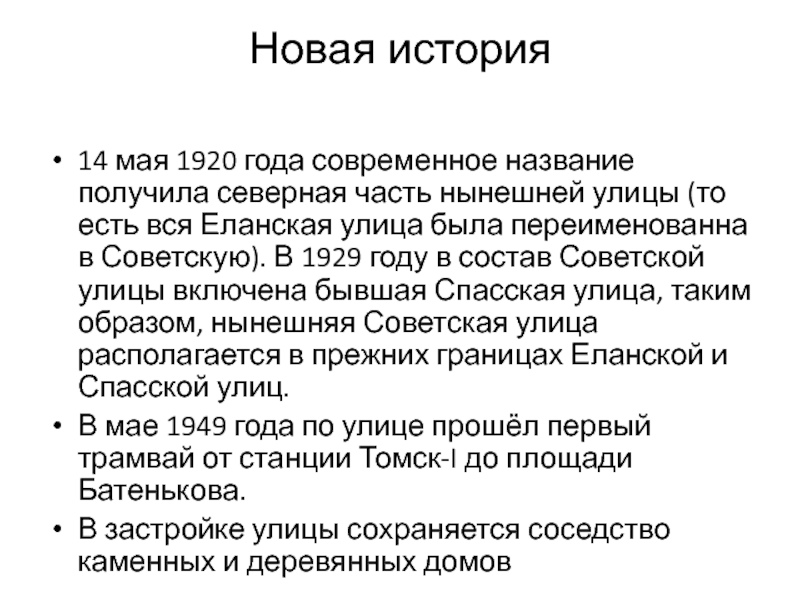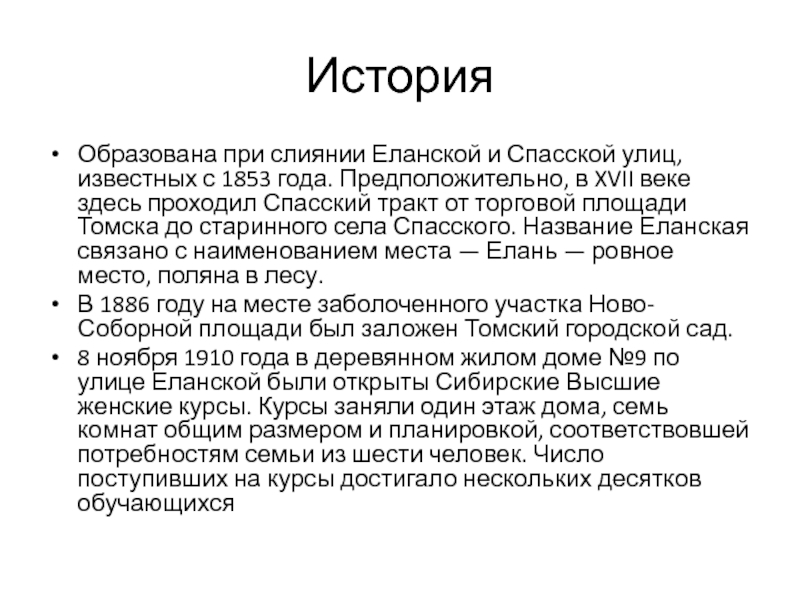 Томска до старинного села Спасского. Название Еланская связано с наименованием места — Елань — ровное место, поляна в лесу.В 1886 году на месте заболоченного участка Ново-Соборной площади был заложен Томский городской сад.