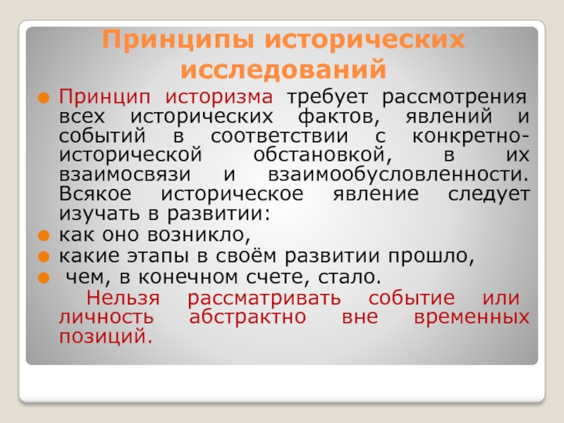 Историк берется оценивать прошлое вне его времени, а исключительно с точки зрения тех ценностей, которые господствуют в настоящем и считаются достаточными для объяснения преемственной связи прошлого с настоящим.