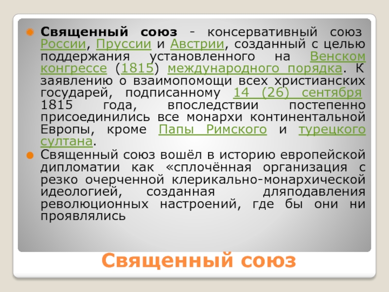 Священный союз вошёл в историю европейской дипломатии как «сплочённая организация с резко очерченной клерикально-монархической идеологией, созданная дляподавления революционных настроений, где бы они ни проявлялись