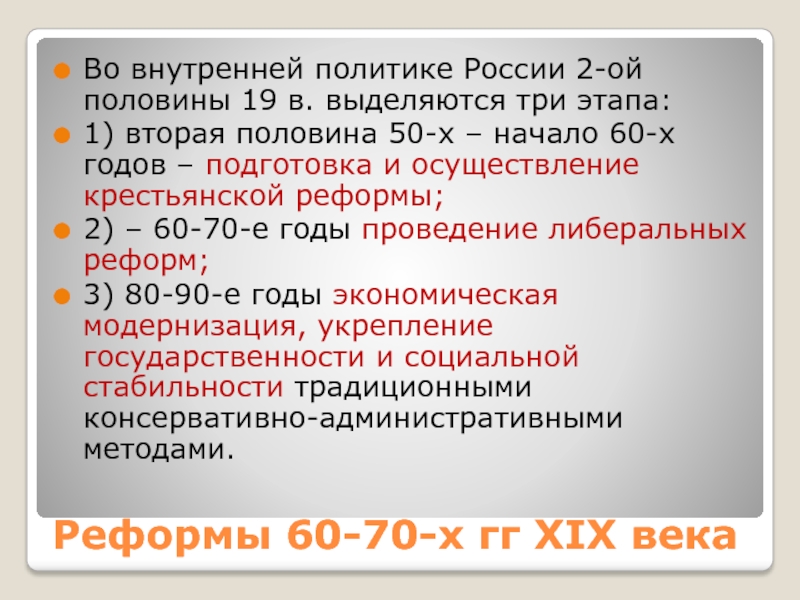 – начало 60-х годов – подготовка и осуществление крестьянской реформы;