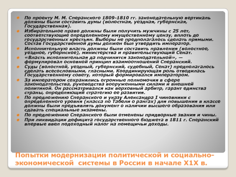 При ликвидации дефицита государственного бюджета в 1811 г. Сперанский впервые ввел подоходный налог на помещичьи доходы.