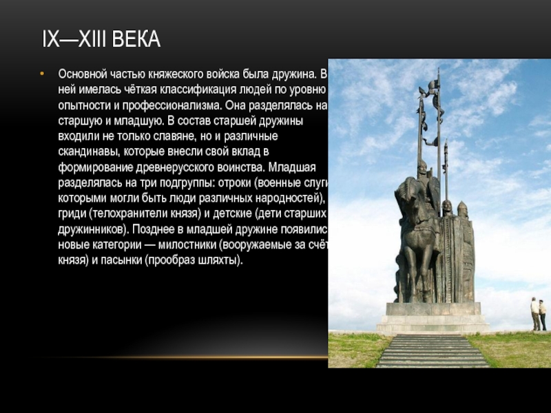 на старшую и младшую. В состав старшей дружины входили не только славяне, но и различные скандинавы, которые внесли свой вклад в формирование древнерусского воинства. Младшая разделялась на три подгруппы: отроки (военные слуги, которыми могли быть люди различных народностей), гриди (телохранители князя) и детские (дети старших дружинников). Позднее в младшей дружине появились новые категории — милостники (вооружаемые за счёт князя) и пасынки (прообраз шляхты).