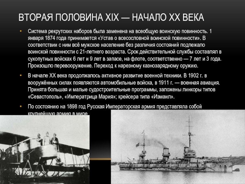 В начале XX века продолжалось активное развитие военной техники. В 1902 г. в вооружённых силах появляются автомобильные войска, в 1911 г. — военная авиация. Принята большая и малые судостроительные программы, заложены линкоры типов «Севастополь», «Императрица Мария»; крейсера типа «Измаил».