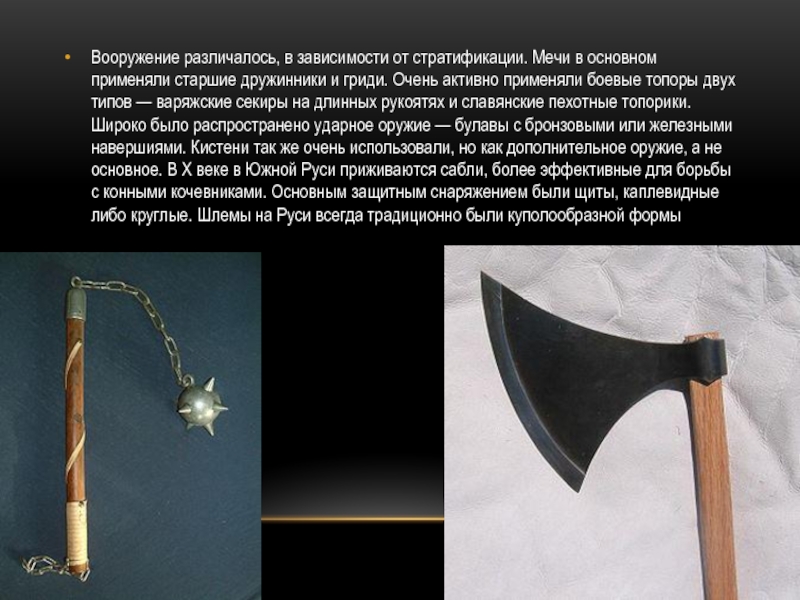 типов — варяжские секиры на длинных рукоятях и славянские пехотные топорики. Широко было распространено ударное оружие — булавы с бронзовыми или железными навершиями. Кистени так же очень использовали, но как дополнительное оружие, а не основное. В X веке в Южной Руси приживаются сабли, более эффективные для борьбы с конными кочевниками. Основным защитным снаряжением были щиты, каплевидные либо круглые. Шлемы на Руси всегда традиционно были куполообразной формы