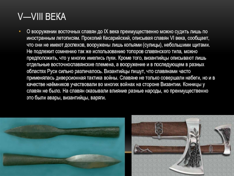 века, сообщает, что они не имеют доспехов, вооружены лишь копьями (сулицы), небольшими щитами. Не подлежит сомнению так же использованию топоров славянского типа, можно предположить, что у многих имелись луки. Кроме того, византийцы описывают лишь отдельные восточнославянские племена, а вооружение и в последующем в разных областях Руси сильно различалось. Византийцы пишут, что славянами часто применялась диверсионная тактика войны. Славяне не только совершали набеги, но и в качестве наёмников участвовали во многих войнах на стороне Византии. Конницы у славян не было. На славян оказывали влияние разные народы, но преимущественно это были авары, византийцы, варяги.