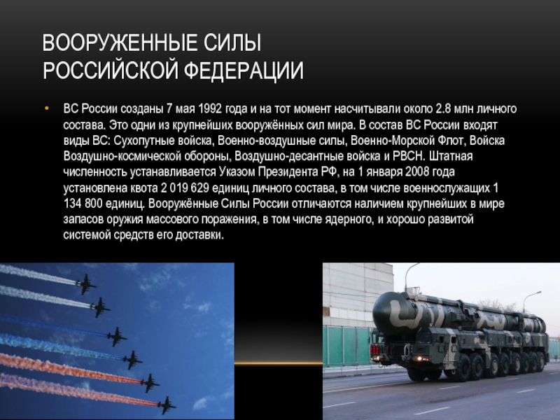 Это одни из крупнейших вооружённых сил мира. В состав ВС России входят виды ВС: Сухопутные войска, Военно-воздушные силы, Военно-Морской Флот, Войска Воздушно-космической обороны, Воздушно-десантные войска и РВСН. Штатная численность устанавливается Указом Президента РФ, на 1 января 2008 года установлена квота 2 019 629 единиц личного состава, в том числе военнослужащих 1 134 800 единиц. Вооружённые Силы России отличаются наличием крупнейших в мире запасов оружия массового поражения, в том числе ядерного, и хорошо развитой системой средств его доставки.
