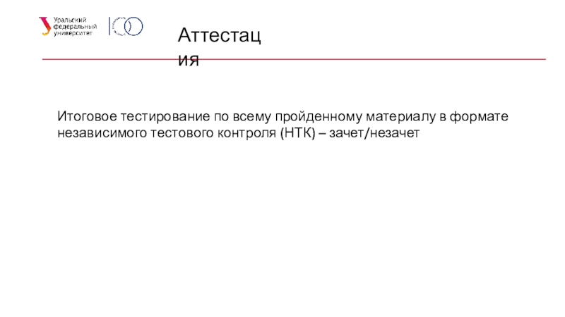 АттестацияИтоговое тестирование по всему пройденному материалу в формате независимого тестового контроля (НТК) – зачет/незачет