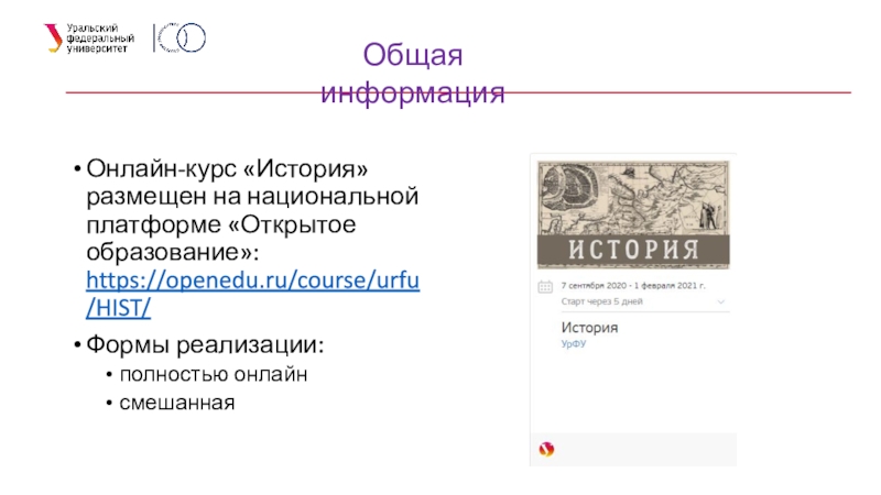 Онлайн-курс «История» размещен на национальной платформе «Открытое образование»: https://openedu.ru/course/urfu/HIST/Формы реализации:полностью онлайнсмешаннаяОбщая информация