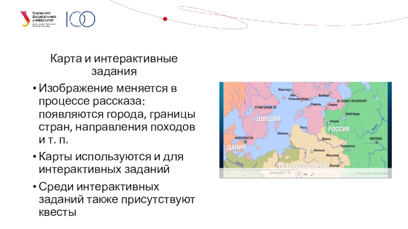 Карта и интерактивные заданияИзображение меняется в процессе рассказа: появляются города, границы стран, направления походов и т. п.Карты