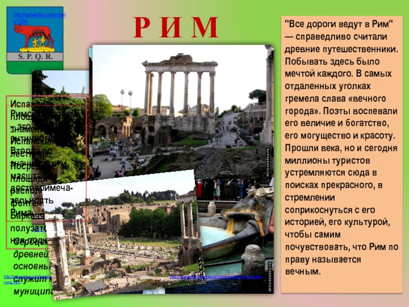 уголках гремела слава «вечного города». Поэты воспевали его величие и богатство, его могущество и красоту. Прошли века, но и сегодня миллионы туристов устремляются сюда в поисках прекрасного, в стремлении соприкоснуться с его историей, его культурой, чтобы самим почувствовать, что Рим по праву называется вечным.