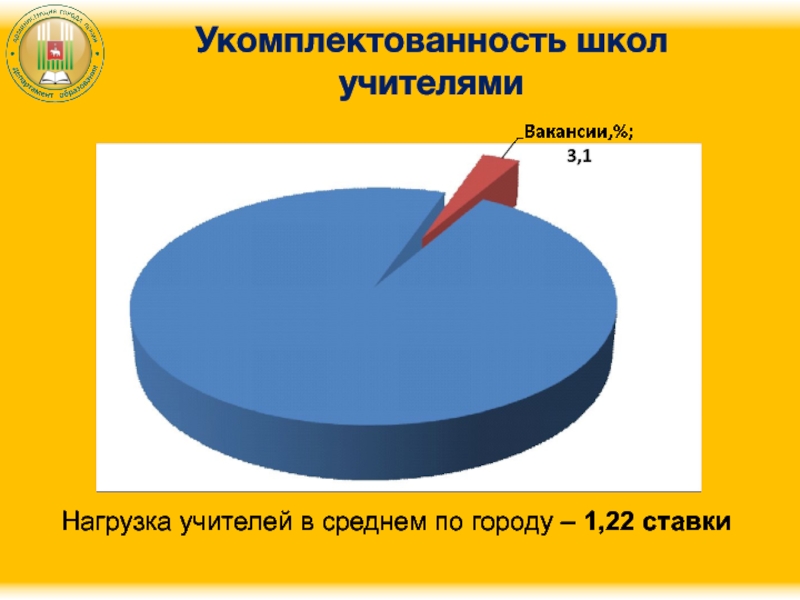 Укомплектованность школ учителямиНагрузка учителей в среднем по городу – 1,22 ставки