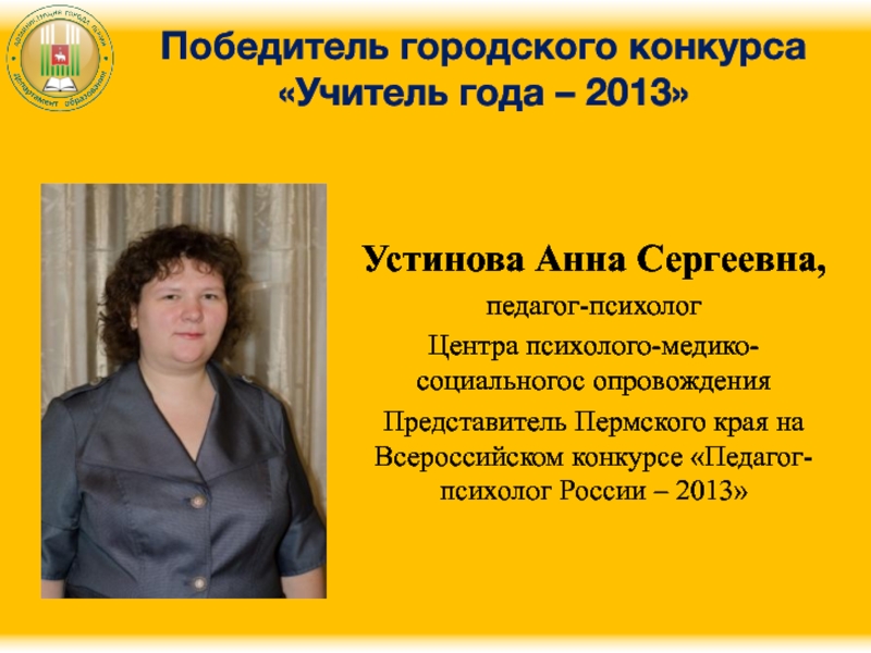 Победитель городского конкурса  «Учитель года – 2013»  Устинова Анна Сергеевна, педагог-психологЦентра психолого-медико-социальногос опровожденияПредставитель Пермского