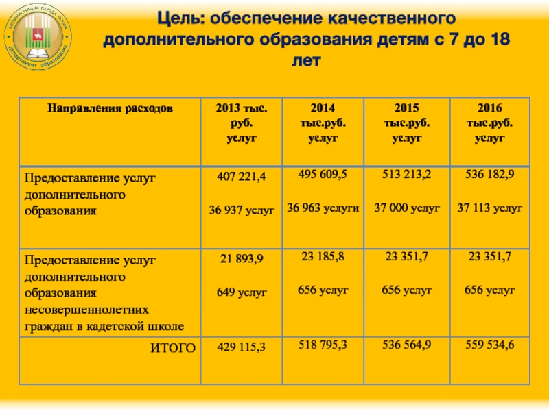 Слайд 29Цель: обеспечение качественного дополнительного образования детям с 7 до 18