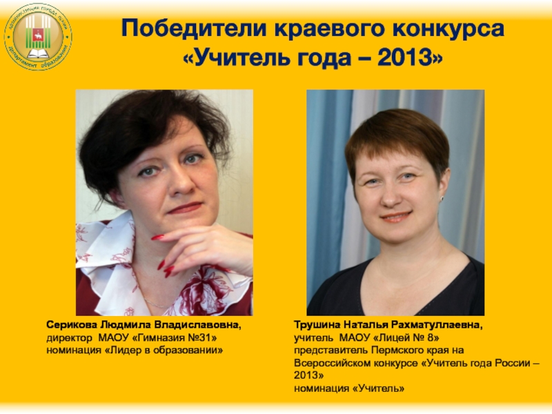 Победители краевого конкурса  «Учитель года – 2013»  Серикова Людмила Владиславовна,директор МАОУ «Гимназия №31» номинация