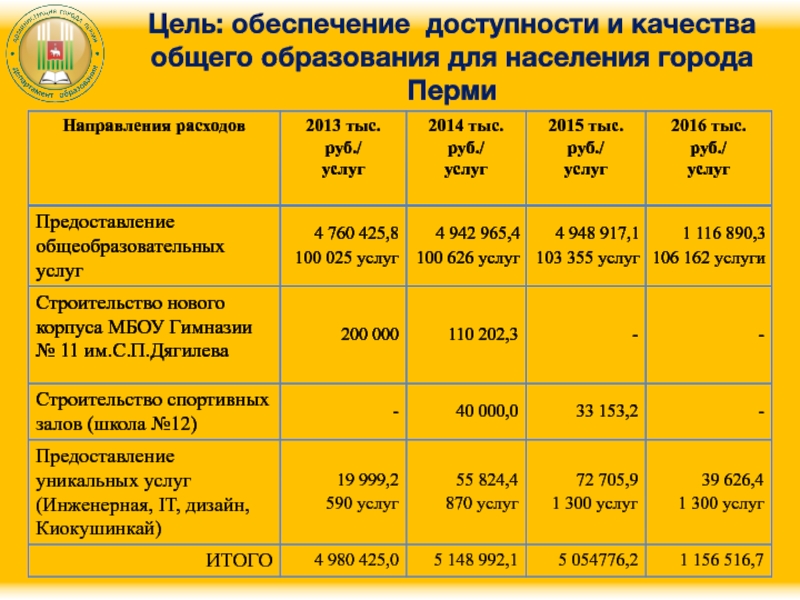 Цель: обеспечение доступности и качества общего образования для населения города Перми