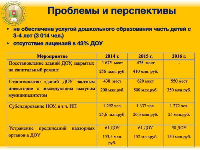 Проблемы и перспективыне обеспечена услугой дошкольного образования часть детей с 3-4 лет (3 014 чел.)отсутствие лицензий в