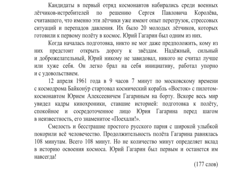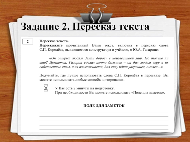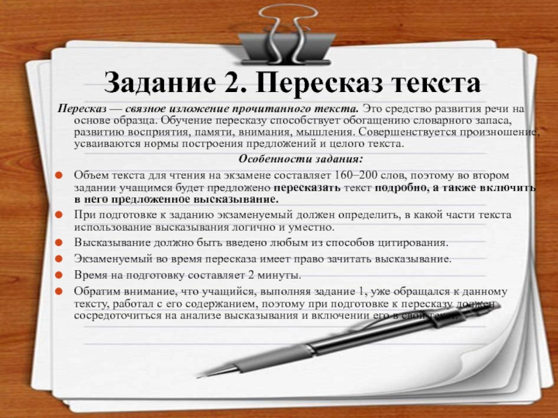 Объем текста для чтения на экзамене составляет 160–200 слов, поэтому во втором задании учащимся будет предложено пересказать текст подробно, а также включить в него предложенное высказывание.