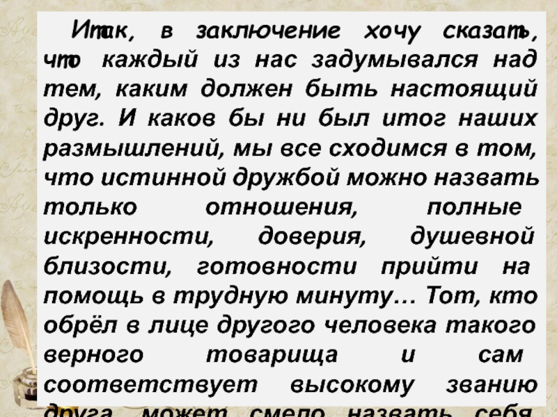 ни был итог наших размышлений, мы все сходимся в том, что истинной дружбой можно назвать только отношения, полные искренности, доверия, душевной близости, готовности прийти на помощь в трудную минуту… Тот, кто обрёл в лице другого человека такого верного товарища и сам соответствует высокому званию друга, может смело назвать себя счастливцем.