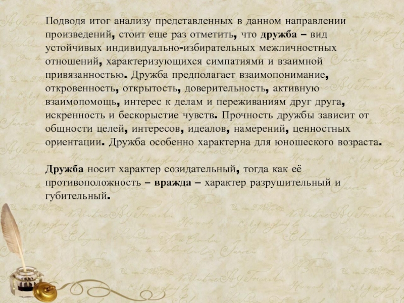 даже целыми народами, а также об истоках и последствиях вражды между ними. Содержание многих литературных произведений связано с теплотой человеческих отношений или неприязнью людей, с перерастанием дружбы во вражду или наоборот, с изображением человека, способного или не способного ценить дружбу, умеющего преодолевать конфликты или сеющего вражду.